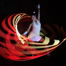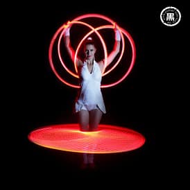 „RADIANT RINGS” ist die neue Action-geladene Leuchtreifen-Show von Spherina. Die farbenfrohen LED Hula Hoops werden in diesem Show Act mit beeindruckender Energie und Finesse durch die Luft geschwungen. Die leuchtenden Reifen schwingen mühelos um den Körper, dabei sorgen die LED Lichter für eine faszinierende visuelle Wirkung. Die Lichtreifen sind farblich perfekt zur Musik synchronisiert.